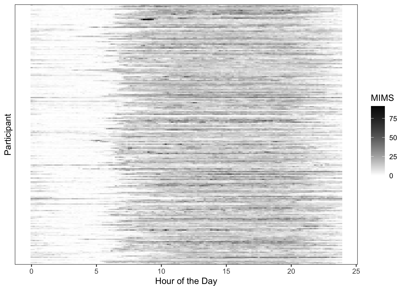 This visualization indicates that activity is strongest between the hours of 8AM and 10PM, as would be expected. However, there is substantial heterogeneity both in when individuals start and end their days, as well as the amount of activity they engage in on average throughout the course of the day.
