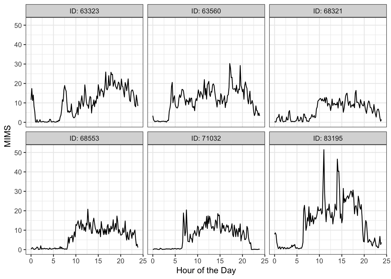 Now that we have the data, we perform quick visualizations to get an idea of the types of patterns present. We first randomly select 5 participant’s MIMS (monitor-independent movement summary) curves.