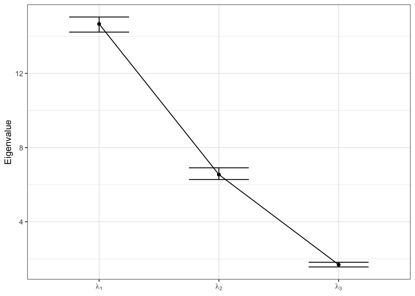 We can also evaluate the variability decomposition by plotting the estimated eigenvalues \(\lambda_k\) sequentially with their equal-tail 95% credible intervals.