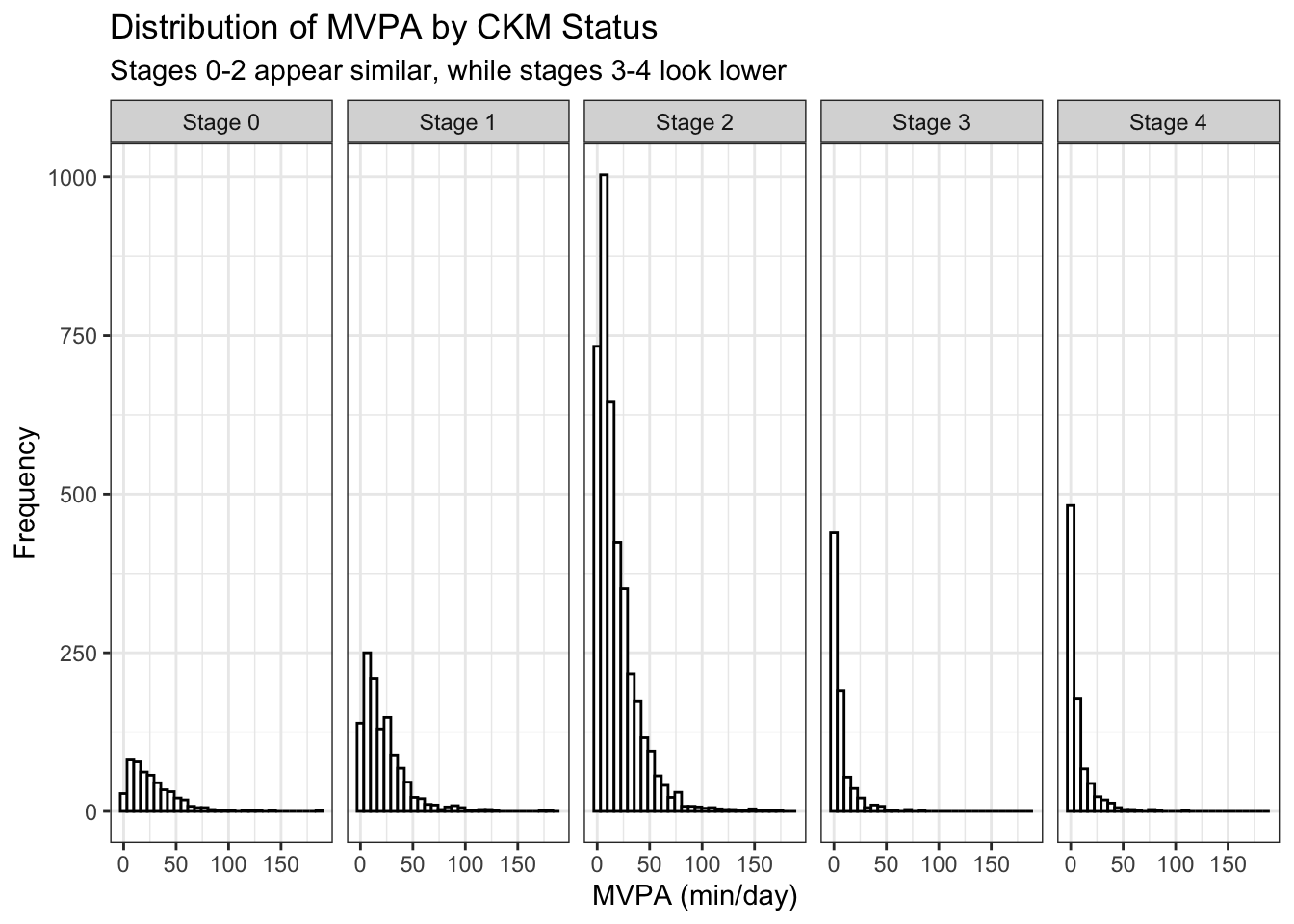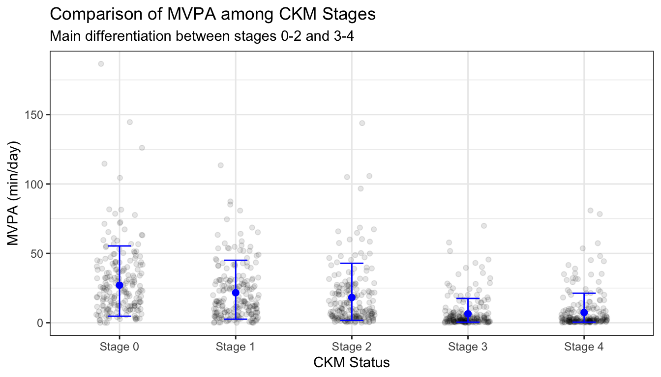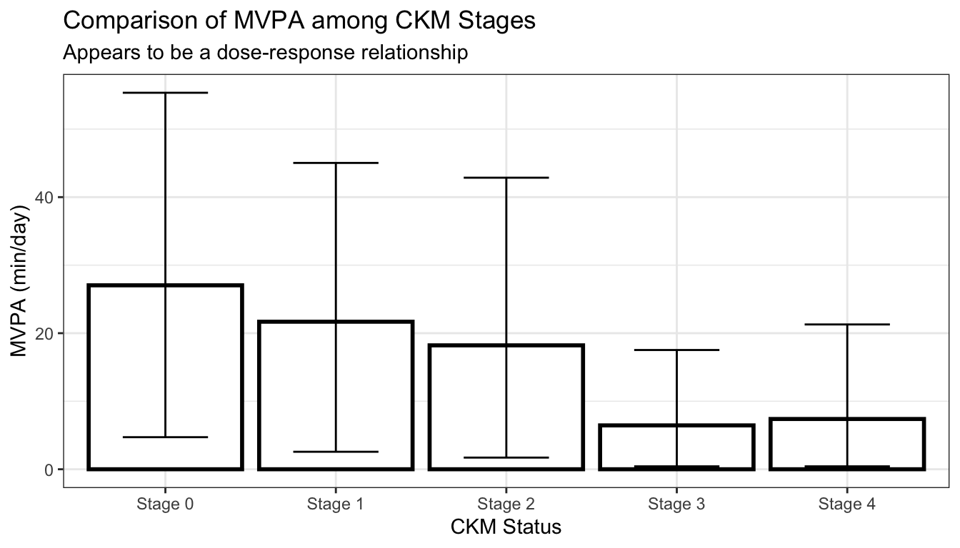 We first leverage a standard bar chart with uncertainty bounds to first visualize the mean minutes of MVPA by CKM status: