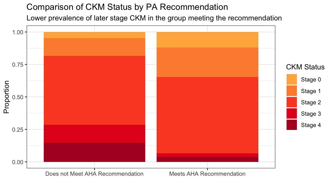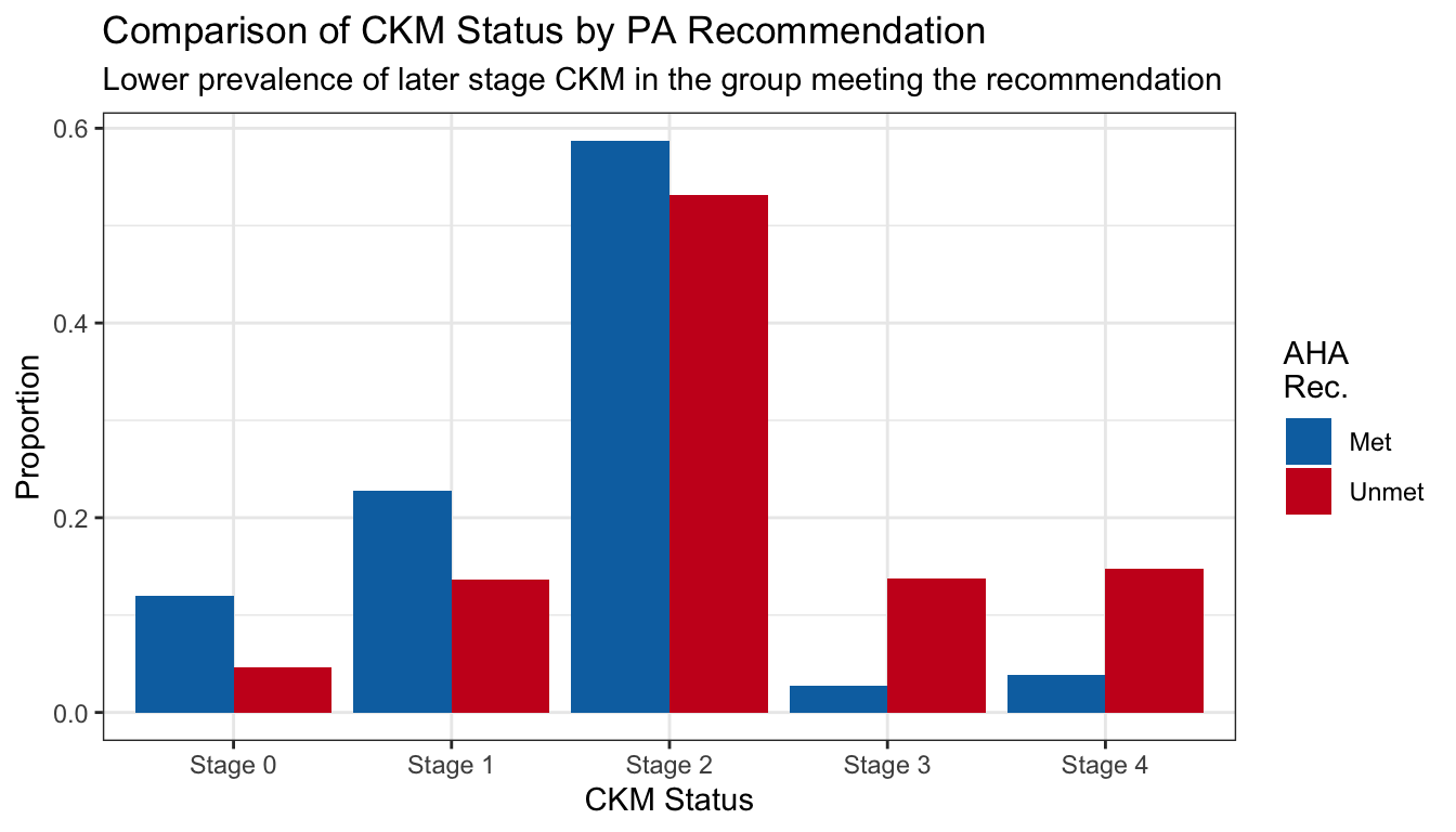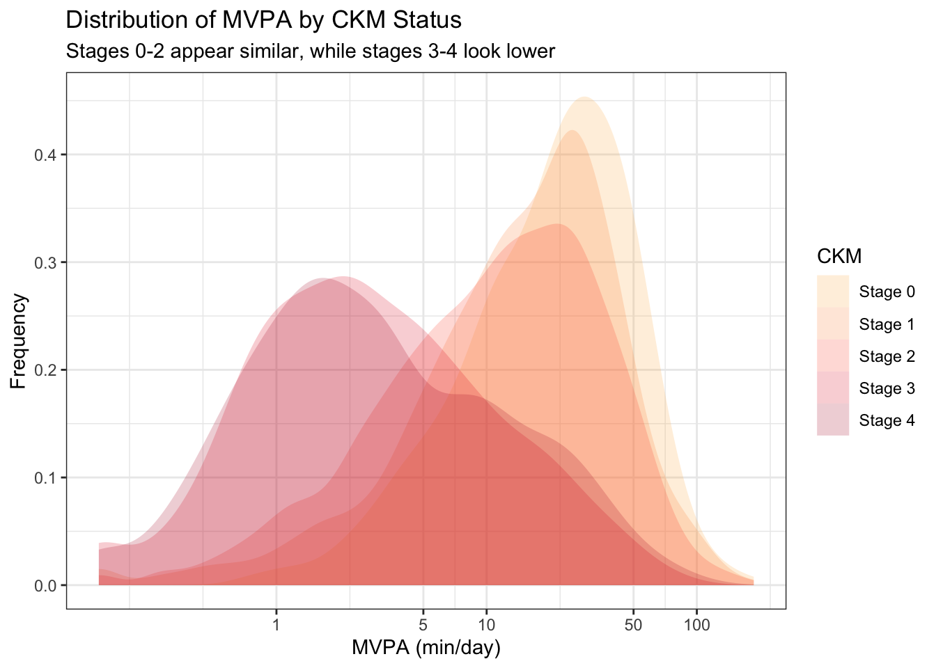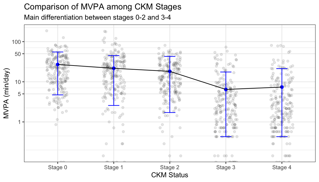 We first leverage a standard bar chart with uncertainty bounds to first visualize the mean minutes of MVPA by CKM status: