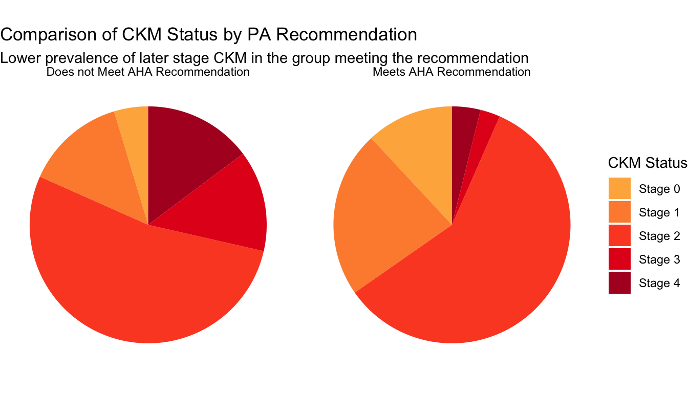 To visualize the CKM status compositions within the subpopulations meeting and not meeting the AHA MVPA guideline, a first thought might be to use pie charts. This makes some sense, as we wish to display proportions within each group: