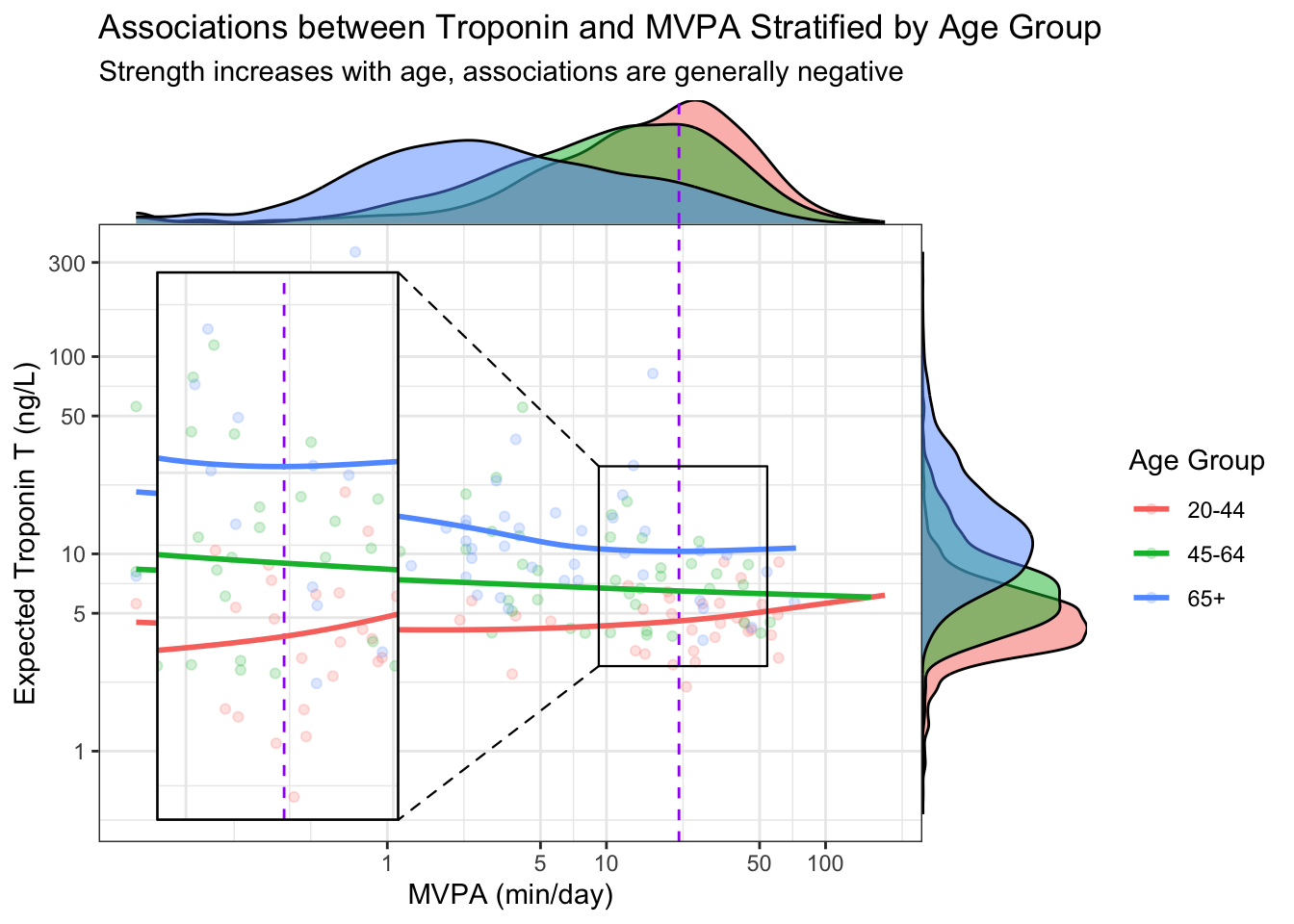 We want to both understand the marginal distributions of activity and troponin by age group, as well as the association between these two around the AHA recommendation. For these purposes, and to ease comparison, we combine into a single plot with marginal visualizations and a magnification plot: