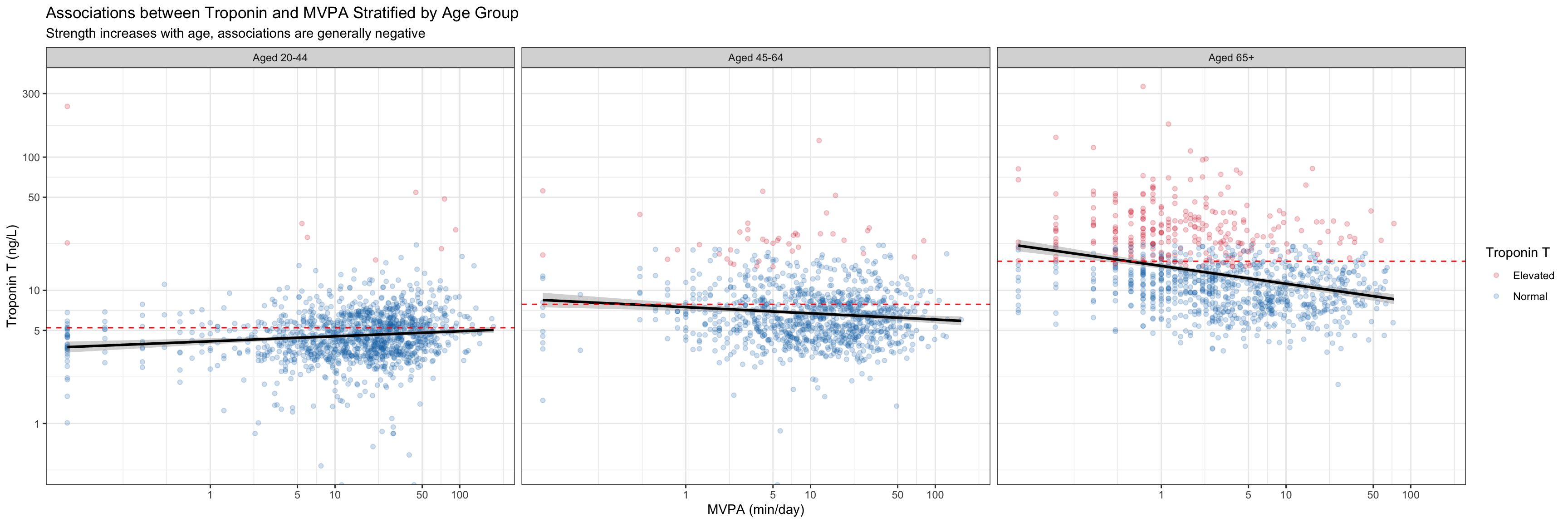 Wisualizing expected probability of exceeding this threshold, particularly just using a model, obfuscates the data. Instead we can simply plot troponin vs activity and corresponding smooths, stratified by age: